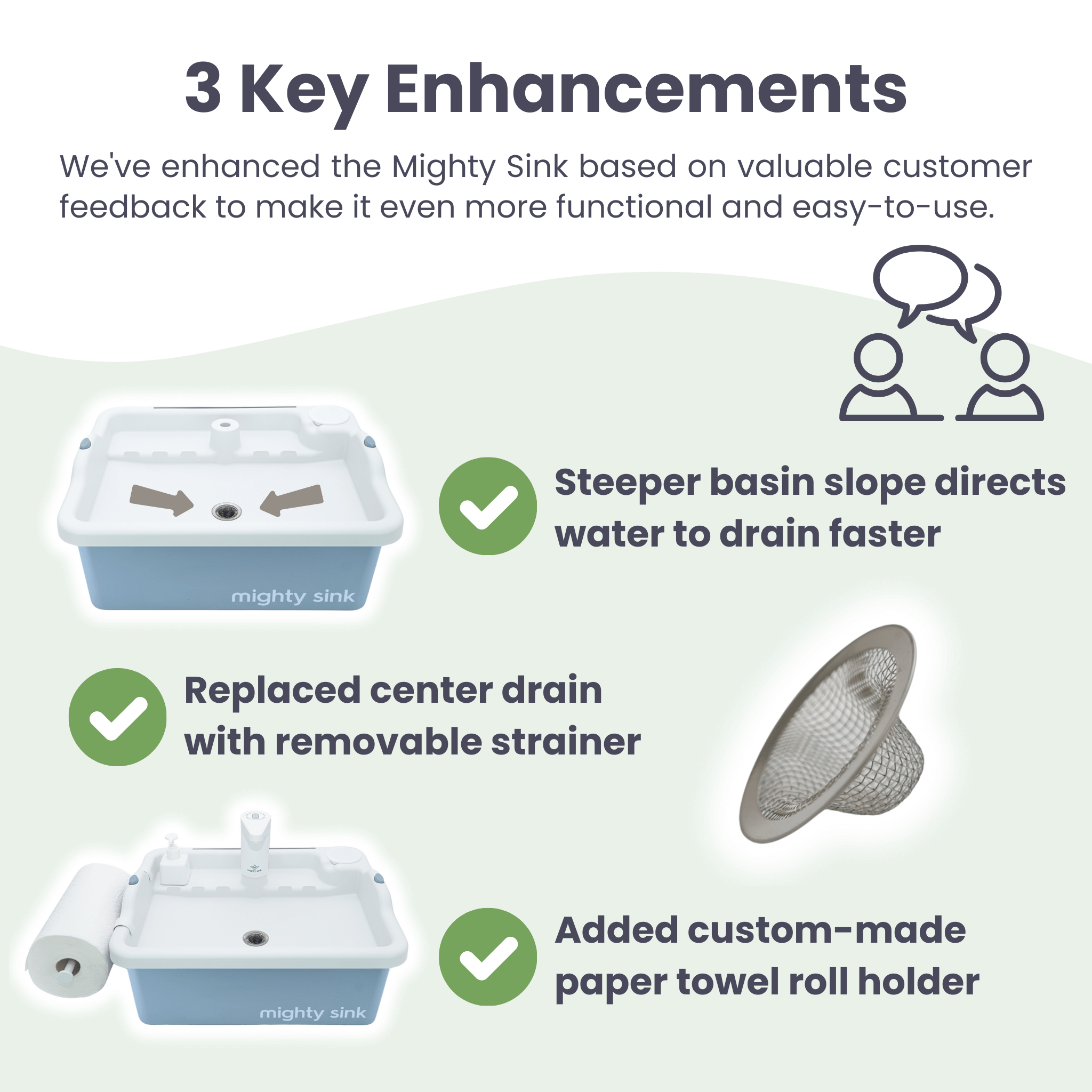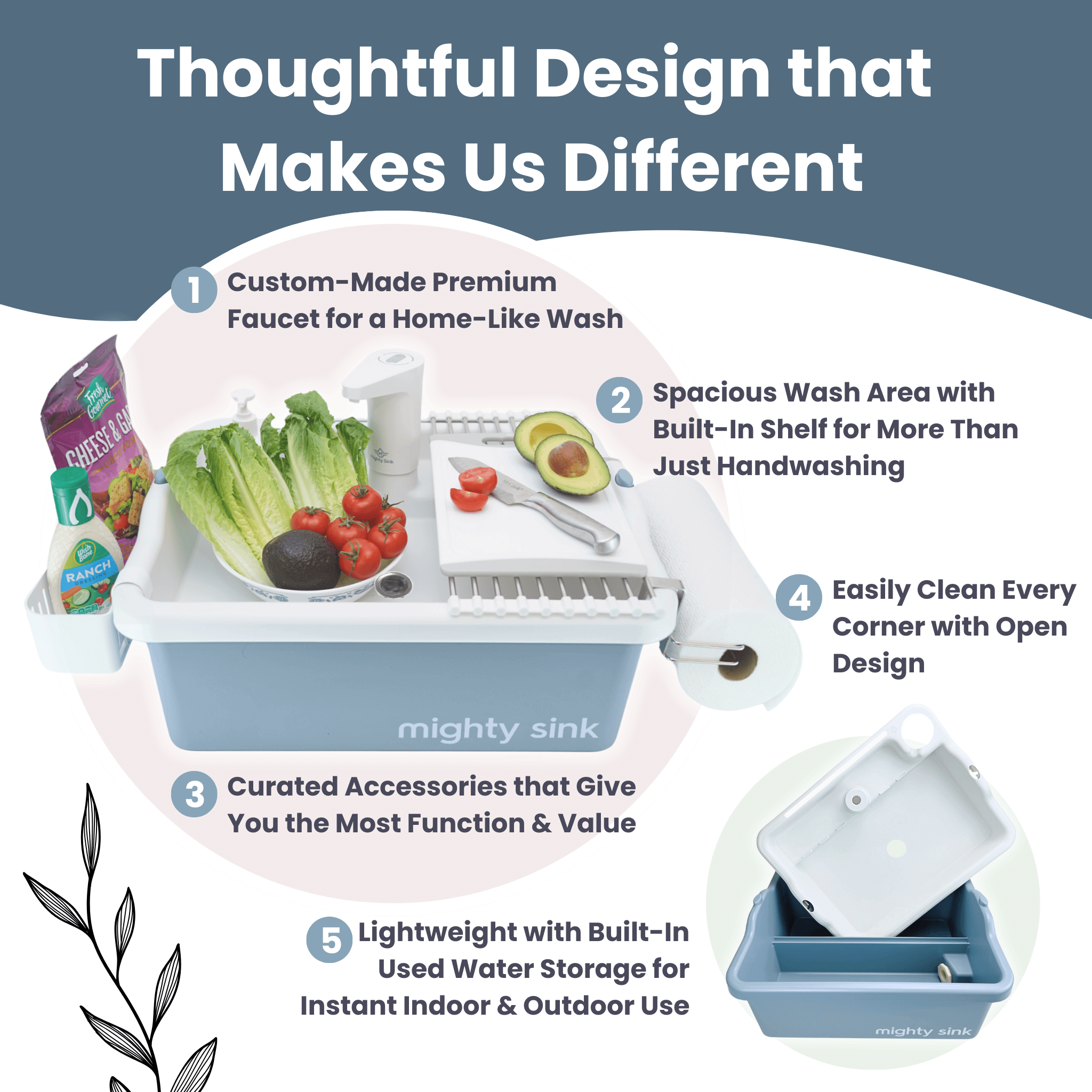 Meet the Mighty Sink Portable Sink—a modern, portable washing solution that brings the comfort and convenience of your home sink anywhere you need it. With a spacious washing area, an electronic faucet for automatic water dispensing, and thoughtful accessories like a built-in paper towel roll holder, the Mighty Sink is your home sink away from home. Perfect for art studios, classrooms, backyards, campsites, and more—it’s washing made easy, wherever life takes you.